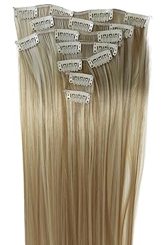 8 Tressen 18 Clips : Hochwertig Synthetik Haare für Clip in Extensions Haarteile, sehr schön and sanft zum günstigen Preis. Viele Farben stehen zur Auswahl! Durch die Clip Technik einfach und unkompliziert einsetzbar und wiederverwendbar. Geben Sie Ihrem Haar mehr Volume und Länge. Für jeden besonderen Anlass geeignet. Waschbar und gut zu frisieren(max. 160 Grad Celsius), natürlich, weich und angenehm. Kein Einfluß auf eigene Haare, bequem für den ganzen Tag Anwendung. Set-Inhalt: 8 Tressen(Haarteile) 18 Clips: 1x16.5cm breite Tressen(jeweils 4 clips), 2x12cm breite Tressen(jeweils 3 clips), 2x9cm breite Tressen(jeweils 2 clips), 1x6.3cm breite Tressen(jeweils 2 clips), 2x3cm breite Tressen(jeweils 1 clip) Ausgezeichnete Wahl für Alltag und andere besondere Situationen: Hochzeit, Party, Geburtstag, Karneval usw.