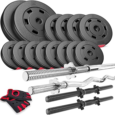 Hantelstangen-Set: 1x Curlstange 120cm aus Chrom Stahl (7kg), 2x Kurzhantel 35cm aus Hohlstahl (je 0,5kg), 30 mm Ø, gerändelte Griffe für sicheren Halt, inkl. 6 Sternverschlüssen Hantelscheiben-Set 27,5 kg: 2x 5 kg, 4x 2,5 kg und 6x 1,25 kg Zement Gewichte-Set, 30/31 mm Bohrung, ummantelt mit Kunststoff Bodenschonende Hantelscheiben: Kunststoff Ummantelung ermöglicht geräuscharmes Training - ideal fürs Home-Gym Scheibenrotation Minimiert: Gewichte ausgestattet mit ineinander greifenden Noppen und Mulden Ob Einsteiger oder Profi, das Komplett-Set ist ideal für Kraftsport, Bodybuilding, klassisches Hanteltraining, Bankdrücken, sowie Schulter-, und Armtraining