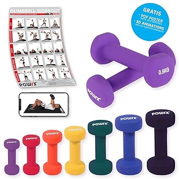 PRODUKT - Sie erhalten 2 Vinyl Hanteln in Lila (0,5 kg) I Link Workout Poster per Mail in Ihrer Versandbestätigung. TRAININGSMÖGLICHKEITEN - Holen Sie sich das Fitnessstudio nach Hause und trainieren Ihre Bizeps und Trizeps professionell. Mit dem gezielten Kurzhantel-Training können Sie Ihren Oberkörper umfassend stärken und Muskelpartien auch im Rücken-, Schulter- und Bauchbereich aufbauen. TRAININGSEFFEKTE/ERFOLGE - Die POWRX Kurzhantel liegt frei in der Hand und es wird nicht nur ein Muskel isoliert trainiert, sondern alle Muskeln die bei dieser Bewegung aktiv werden. Dies fördert nicht nur den Muskelaufbau, sondern auch die Beweglichkeit und das Zusammenspiel der einzelnen Muskelpartien. PRODUKTEIGENSCHAFTEN - Durch die Vinylbeschichtung ist die Hantel ganz leicht zu reinigen und dadurch sehr Hygienisch. Zudem schützt die Beschichtung den Fußboden vor Beschädigung. GEPRÜFTE QUALITÄT - Wir haben für unsere POWRX Kurzhantel nur die Besten Materialien verwendet und diese hochwertig verarbeitet.
