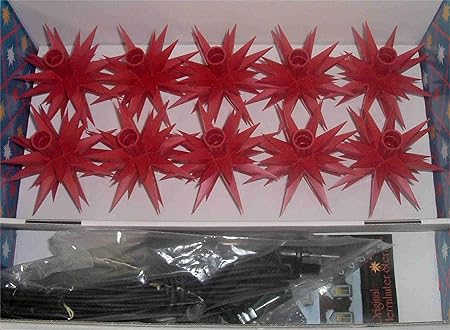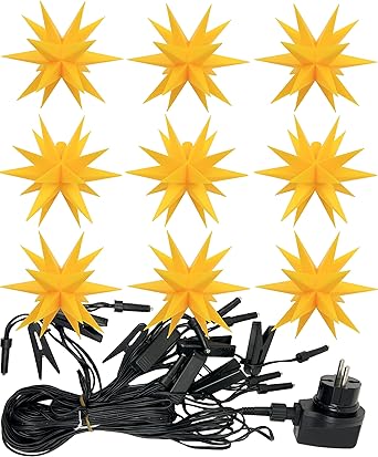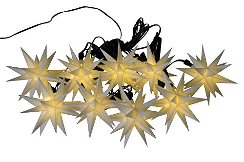 Lichterkette mit 9 Kunststoffsternen, 18 Zacken, Durchmesser 12cm 5 Meter Anschlusskabel mit Außen-Trafo, inkl. Befestigungsklammern am Kabel 9 LED-Leuchten, warm-weiß, jeweils 1m Kabel zwischen einzelnen LEDs Wetterfest, UV-beständig, Frost-resistent Lieferumfang inkl. LED-Leuchten und Trafo (IP-44), für den Außenbereich geeignet