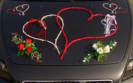 DEKORIERT RATAN HERZEN Auto Schmuck Braut Paar Rose Deko Dekoration Autoschmuck Hochzeit Car Auto Wedding Deko (Rot / Weiß)