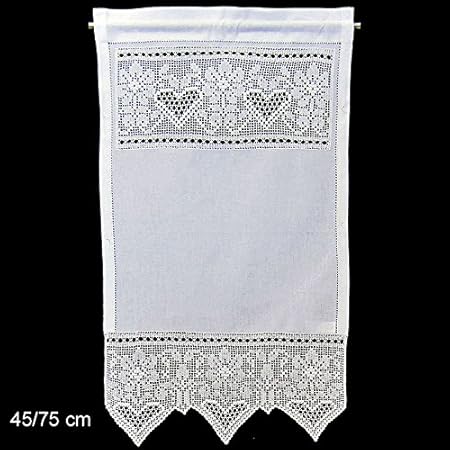 Elegante weiße Scheibengardine mit Häkelspitze Lochstickerei mit Stabdurchzuglöchern für Scheibenstab, Material: 100 % Baumwolle Waschbar bei 60 Grad 45 x 75 cm (B x H)
