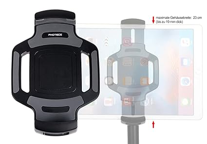 Universal-Halterung Pro für Tablets bis 27,5 cm (bis ca.14' Diagonale) und Smartphones ab 5,5 cm. Tablet oder Smartphone sind im Handumdrehen eingesetzt und wieder aus der Halterung genommen. Durch gleich 2 Anschlussgewinde und diverse Verstellmöglichkeiten ist unsere Lösung sehr variabel in der Anwendung und der Einstellung des optimalen Blickwinkels. Nutzen Sie das Tablet z.B. als großen Bildschirm an der Spiegelreflex-Kamera (Software/App notwendig!). Die Befestigungsklemme öffnet bis ca. 40 mm und erlaubt eine Montage an allen geeigneten runden oder auch flachen Elementen (Minimum 12mm). Der Klemmhebel kann auch nach dem Festziehen durch eine spezielle Mechanik in eine beliebige Stellung gebracht werden, steht so nie im Weg. Die Kontaktpunkte sind gummiert, d.h. es entstehen keinerlei Kratzer etc. am Tablet bzw. Smartphone. WICHTIG: dieses Modell ist NICHT für Tablets mit zusätzlicher Hülle geeignet. Bitte greifen Sie ggf. auf unser neuestes Modell V3 zurück, welches auch Tablets mit Schutzhülle (bis 19mm) und bis 14' Diagonale tragen kann: Photecs Universal Tablet-Halterung Pro V3 (ASIN: B079TNPLKM). Nur wertige Komponenten, die sich gut und präzise einstellen lassen und an denen Sie lange Freude haben werden. Die modulare Bauweise erlaubt diverse Anwendungsmöglichkeiten. Bitte schauen Sie sich alle Abbildungen an, um auch unsere neueren Versionen zu sehen. Lieferumfang: 1x Photecs Tablet-Halterung Pro V1. Die auf den Bildern gezeigten Tablets und Smartphones sind nicht Teil des Lieferumfangs! Videos zum Produkt: https://youtu.be/tEn6DLCCj6g und https://youtu.be/dWWT0_wOT4I