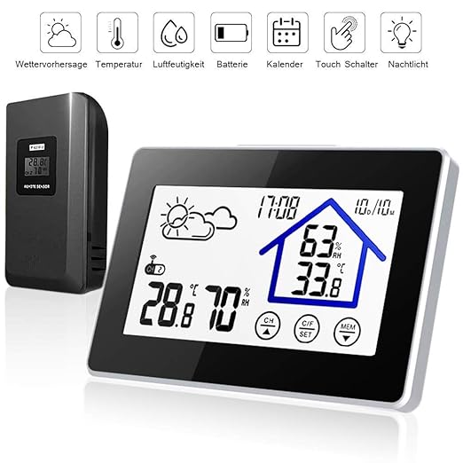 ?SMART KOMFORTNIVEAU-ANZEIGE?Die Funk Wetterstation zeigt die Innen- und Außen Temperatur, die Innen- und Außen Luftfeuchtigkeit an, Mit der Komfortstufe der Thermometer Hygrometer informiert man sehr einfach, ob die Luft DRY, COMFORT, oder WET ist. ?HOHE ZUVERLÄSSIGKEIT & GENAUIGKEIT?Schnelle Reaktion, die alle 10 Sekunden misst, um aktualisierte und genaue Messwerte zu liefern, großer Messbereich, der die Außen Temperatur von -40°C bis +60°C und die Feuchtigkeit von 20-95% misst. ?Großes LCD Farbdisplay mit Touchscreen?Mit 4.13’’x2.36’’ LCD Bildschirm und weißer Hintergrundbeleuchtung können Sie den Inhalt auf dem bildschirm von jedem winkel aus deutlich sehen. Mit Touch-Taste ist es mehr einfacher zu bedienen. Es bring dir ein Intelligenteres Leben. ?Breite Verwendung?:Sie können unsere Wetterstation im Wohnzimmer, Badzimmer, Büro, Gewächshaus, Camping, Lagerkeller und so weiter benutzen. Und Sie können es auch als Geburtstags- oder Weihnachtsfestgeschenk an Ihre Freunde oder Ihre Familie schicken ?Min.-/Max Werte:?Der Funkthermometer speichert automatisch die Min.-/Max. Werte der Temperatur und Feuchtigkeit innerhalb 24h.