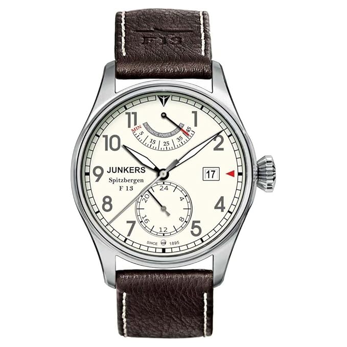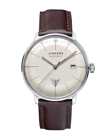 Junkers Automatic Bauhaus Tagesdatumanzeige, Sekundenstopp Edelstahlgehäuse mit Hesalitglasfenster und Glasboden dunkelbraunes Lederarmband Wasserdichte: 3 atm