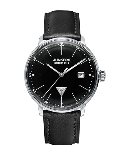 Junkers Automatic Eisvogel Tagesdatumanzeige, Sekundenstopp Edelstahlgehäuse mit Glasboden schwarzes Lederarmband Wasserdichte: 5 atm