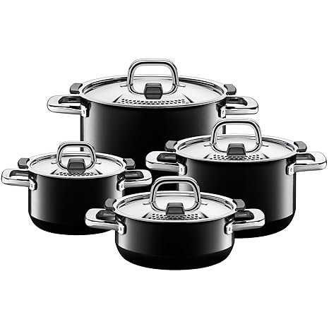 Inhalt: 1x Bratentopf mit Deckel Ø 20 cm (V 2,5l), 3x Fleischtopf mit Deckel Ø 16 cm (V 1,9l), Ø 20 cm (V 3,3l), Ø 24 cm (V 5,7l), 1x Stielkasserolle ohne Deckel Ø 16 cm (V 1,5l) - Artikelnummer: 1730156380 Material: Cromargan Edelstahl rostfrei 18/10 - spülmaschinengeeignet, pflegeleicht, backofengeeignet, geschmacksneutral und säurefest Für alle Herdarten geeignet - auch für Induktion. TransTherm-Allherdboden: Bodenkonstruktion mit gleichmäßiger Wärmeverteilung und langer Wärmespeicherung für energiesparendes Kochen Breiter Schüttrand für ein tropffreies Ausgießen Entwickelt in Deutschland