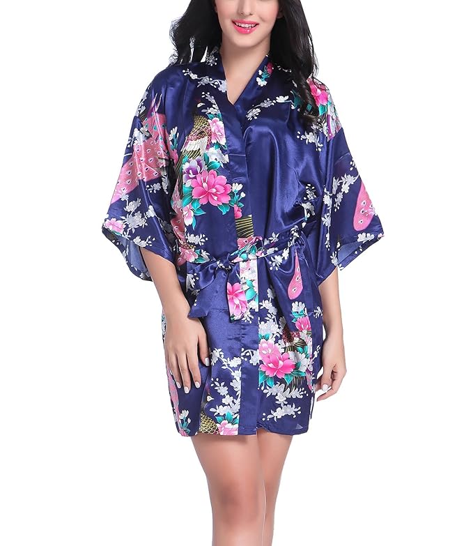 Aibrou Damen Morgenmantel Kimono Satin Kurz Nachtwäsche Bademantel Robe Schlafanzug Mit Peacock und Blumen