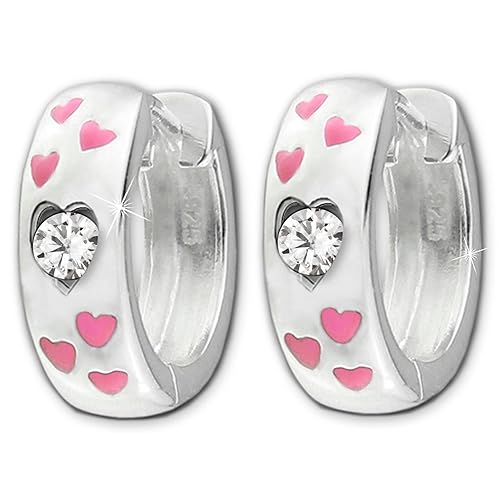Ohrschmuck für Mädchen: ein Paar Klappcreolen Ø ca. 13 mm und ca. 4 mm breit mit Klappscharnier elegante Scharniercreolen: ein Hingucker ist der weiße runde Zirkoniastein herzförmig gefaßt und in Brillantqualität und weitere 6 kleine rosa lackierte Herzchen Herzohrringe: schönes kindliches Design mit sicherem und leichtgängigen Klappscharnierverschluß Kindercreolen in matt geeister Optik hergestellt aus 925er Sterling Silber, mit Echtheitsstempel und ca. 3,4 g schwer hochwertige Qualität und Lieferung inklusive CLEVER SCHMUCK-Etui, ideal zum Verschenken oder Aufbewahren!