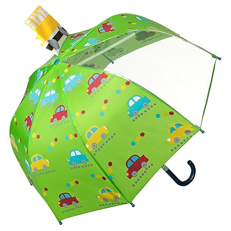 DESIGN & MOTIV: Die Glockenform mit starker Wölbung bietet einen besonderen Schutz vorm Regen. Viele bunte Autos sind auf diesem Schirm zu finden - es sieht außerdem so aus, als würde ein gelber Bus in 3D-Optik über den Schirm fahren. Um dem Kind freie Sicht zu gewährleisten, ist ein Segment aus durchsichtigem Plastik - damit der volle Durchblick erhalten bleibt