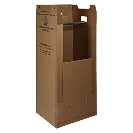 Qualität: 2-wellig (2.40 BC) Innenmaß: 600 x 510 x 1000 mm ausgestanzte Grifflöcher für den Transport kein Klebeband oder zusätzlicher Deckel notwendig inklusive stabiler Metallkleiderstange