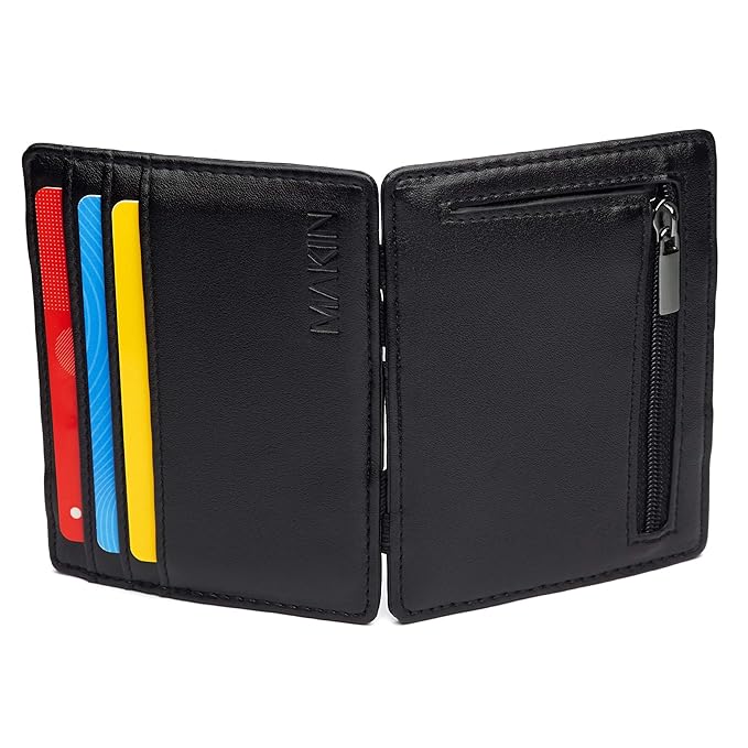 ? KOMPAKT UND TROTZDEM FUNKTIONAL - Besitzt trotz geringer Größe von 11,4 x 8,2 x 2,3cm 11 Kartenfächer (10 Innenfächer, 1 Schiebefach außen) Das äußere Schiebefach ermöglicht einen schnellen Zugang zu häufig genutzten Karten. Durch die kompakten Abmessungen passt die hochwertige Geldbörse in jede Hosentasche ohne sie auszubeulen ? EDELSTAHL GELDSCHEINKLAMMER - Mit der fest eingebauten Geldspange aus rostfreiem Edelstahl lassen sich Geldscheine sicher befestigen ? TÜV GEPRÜFTE SICHERHEIT - Durch ein unabhängiges Institut geprüfte Abschirmung der RFID Frequenz 13,56 MHz. Ihre Kreditkarten mit NFC-Chip werden vor dem Auslesen geschützt ? MIT MÜNZFACH – Ein kleines praktisches Münzfach mit Reißverschluss ermöglicht es einige Münzen und Kleingeld aufzubewahren ? DESIGNED IN GERMANY - Sorgfältig ausgewählte Materialien und deutsche Genauigkeit sorgen für Langlebigkeit und hochwertiges Design. Herrenportemonnaie Kreditkartenhalter Kreditkartenportemonnaie