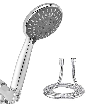 ?Duschkopf mit Schlauch, universal Handbrause mit 3 Funktionen, Chrom ABS, Rückstau Prävention.Duschkopf Durchmesser - 4.5 in/110mm ; Doppelte Schnalle Schlauchlänge - 1,5m. ?Drei Einstellungen: Handbrause mit drei Sprühmustern - Regenschauer; Massage - Strahl; Regen und Massage Strahlarten. ?Reinigungsfreundliche Kopfbrause: Schnelle Anti - Kalk - Funktion .Kalk lässt sich von den Noppen ganz leicht abrubbeln. ?Oberflächenbehandlung?Körper verchromt?Acetat-Spray-Test bis zu 9 Stufen (ASS24H bis zu 9), Starke Resistenz gegen Salzspray Korrosion ?Herstellergarantie: Aus Überzeugung für unseren CLOFY Duschkopf geben wir eine Zufriedenheitsgarantie von 10 Jahren. › Weitere Produktdetails