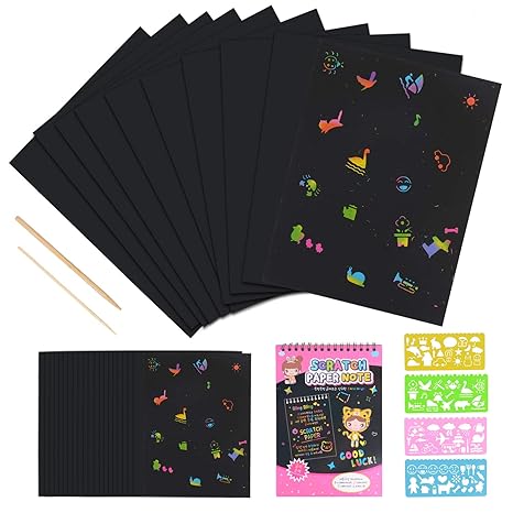 Paket enthält: 50Stück 13 cm x 18.5cm großes Kratzkunstdruckpapier;4 Schablonenlineale; 5 Holzstifte. Ideal für doodle, notizen, skizze, zeichnen usw. Bringen viele Spaß und verbessern Kreativität für Kinder. Speziell beschichtete Blätter, aus denen Kinder ein gewünschtes Motiv auskratzen können MEHRERE VERWENDUNGEN: Sie können die schwarze Beschichtung weg kratzen umso die Regenbogenfarben frei zu legen, um Notizen zu machen, eine Karte zu kreieren, zu skizzieren, zu zeichnen oder andere DIY Projekte zu machen. Enthält kleine Teile und NICHT geeignet für Kinder unter 3 Jahren!