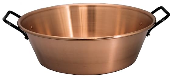 Massive Kasserole aus reinem Kupfer mit Ausgießer zum Herstellen von Karamell oder gerösteten Mandeln Dickwandiger Kupfer Kasserolle, Stiel aus Gusseisen, Nieten aus Kupfer Topf Gewicht: 1,1 Kg - Topf Höhe 8 cm - Inhalt randvoll: 1,6 Liter - Kupferstärke 1,7 mm Dank Kupfers perfekten Wärmeleitfähigkeit lassen sich Karamell und andere Süßspeisen am besten in einem unverzinnten Kupfertopf zubereiten Dieser Kupfertopf ist für alle Herdarten außer für Induktionsherd geeignet!