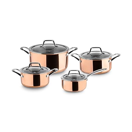 Inhalt: 3x Kochtopf mit Deckel Ø 16 cm / ca. 1,8 l, Ø 20 cm / ca. 3,3 l, Ø 24 cm / ca. 5,4 l; 1x Sauteuse ohne Deckel Ø 16 cm / 1,5 l Material: Kupfer-Mehrschichtmaterial (Außenseiten aus hochwertigem Kupfer, mittlere Lage Aluminium, Innenseite Edelstahl), Metalldeckel mit Silikonrand Geeignet zum Zubereiten und Servieren von z.B. Fleischgerichten, Eintöpfen und Suppen; Dank des Kapselbodens und der massiven Mehrschichtmaterialstruktur eine gesunde und energieeffiziente Art zu kochen Rundum-Schüttrand für einfaches und tropffreies Ausgießen; Ergonomisch geformte Gussgriffe Geeignet für folgende Herdarten: Elektro, Keramik, Gas, Induktion und zur Nutzung im Backofen; Nicht spülmaschinengeeignet