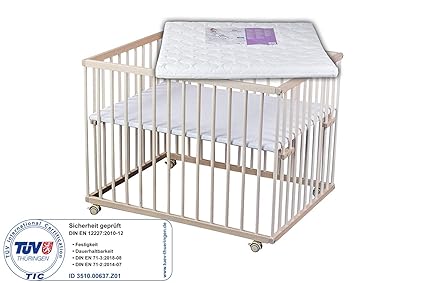 Sämann Laufgitter 100x100 Buche Holz unlackiert, inkl. Matratze, TÜV geprüft 2019, gummierte Rollen