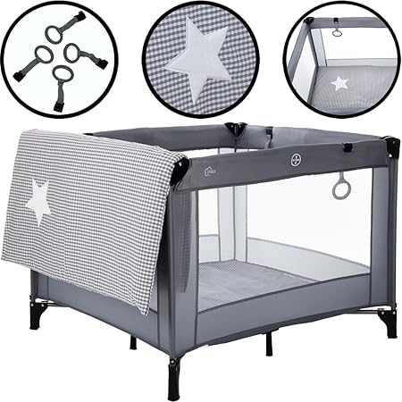 ALL IN ONE: Mit diesem Laufstall haben Sie die optimale Kombination aus Laufstall, Reisebett und Spielstall. Egal für welchen Zweck Sie den Laufstall gerade benötigen er ist super schnell, dank des praktischen Klappmechanismus, auf- sowie abgebaut. SICHERHEIT: Vier Stangfüße sorgen für einen sicheren und stabilen Stand. Die Seiten bestehen aus atmungsaktivem Meshgewebe (durchsichtiger Stoff), wodurch Sie Ihr Kind ständig im Blick haben. LIEFERUMFANG: Inklusive faltbarer Matratze, praktischer Transporttasche und 4 (abnehmbare) Greifringen, in der Farbe Grau, die Ihr Kind bei den ersten Stehübungen unterstützen. MATERIAL: Durch das robuste Material kann der Laufstall bei schönem Wetter auch im Garten oder der Terasse genutzt werden. MAßE: Aufgeklappt 105 x 95 x 73,5 cm (LxBxH) auch für Zwillinge ausreichend Platz forhanden, Platzsparend zusammengefaltet 23 x 22 x 86 cm (LxBxH) › Weitere Produktdetails
