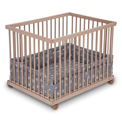 Laufgitter aus Buchenholz mit Polsterboden, Matratze und stufenloser Höhenverstellung - Außenmaß 101 x 101 cm, Höhe 74 cm -