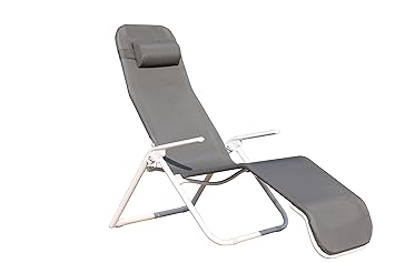Einfach aufzubauende Relaxliege mit abnehmbarem Kopfkissen für entspannte Momente unter blauem Himmel – die Armlehnen des Design-Gartenmöbels sorgen für zusätzliche Entspannung
