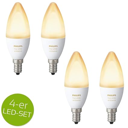 Diese Set besteht aus: 4x Philips hue White Ambiance & Color LED E14 inkl. Philips Hue Bridge Die neue Hue-LED für alle Leuchten und Lampen mit einer E14 Fassung mit Hue Bridge als Starter Kit. Synchronisieren Sie Licht mit Musik und Filmen oder stellen Sie warmweißes Licht ein zum Lesen, Energie tanken und Entspannen Siri - Sprachsteuerung / HomeKit Unterstützung | ebenfalls kompatibel mit Amazon Echo, Amazon Echo Dot und Amazon Tap - Beleuchtung ganz einfach mit Ihrer Stimme steuern Daten zur LED: 6,5 Watt | 470 Lumen | RGBW-LED / Farbtöne: farbig, warmweiß, neutralweiß, kaltweiß | Fassung: E14 › Weitere Produktdetails