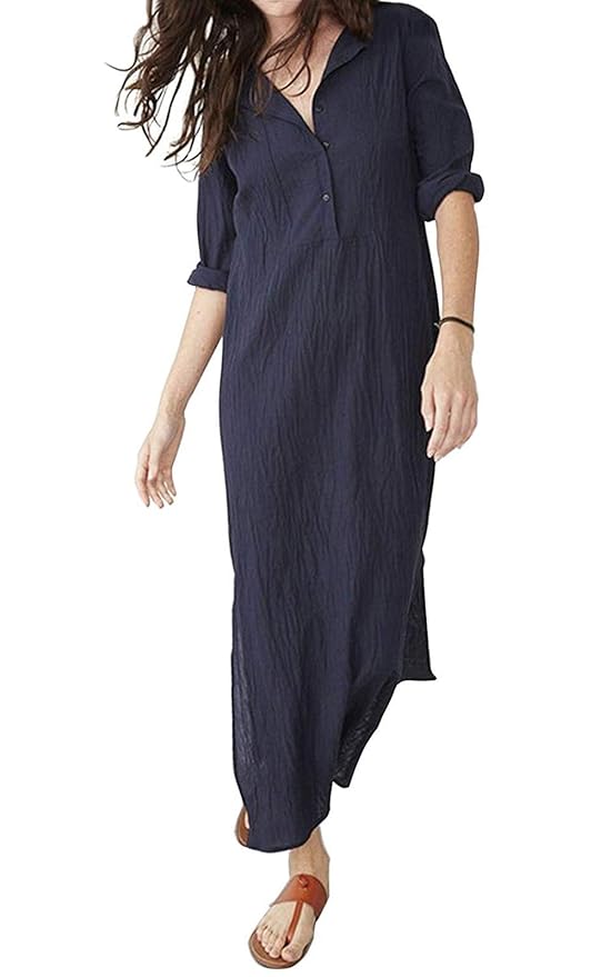 Damen Leinenkleid Sommer Lang Tunika Kleid Vintage Baggy Party Kleider Langarm Baumwolle Leinen Kleid Maxikleid Strandkleid G