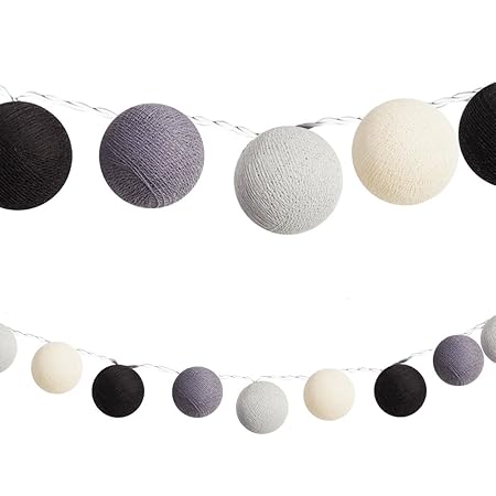 GIGALUMI LED Kugel Lichterkette Ø 6 cm 20 Stück Grau und Weiß Baumwolle Kugel Batterie betrieben innen Deko für Weihnachten,
