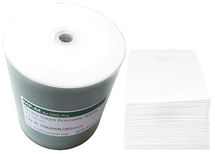 100er Spindel MP-Pro (CMC) High Grade Premium CD-R 80min/700 MB 52x Hi-Res Wide Inkjet Printable weiß + GRATIS 100 CD Papierhüllen mit Folienfenster CD Rohlinge zum Bedrucken mit weiße Beschichtung für hochauflösenden Tintenstrahldruck Vollflächig bedruckbar von 23-118mm, für Tintenstrahldrucker mit CD/DVD-Druckfunktion Unterseite der Disc ist über den kompletten Druckbereich metallisiert, um auch im Innenbereich ein durchgängiges Druckbild zu gewährleisten Top-Qualität mit exzellentem Preis-Leistungs-Verhältnis, hohe Datensicherheit, Haltbarkeit und ausgezeichnete schnelltrocknende Druckoberfläche › Weitere Produktdetails