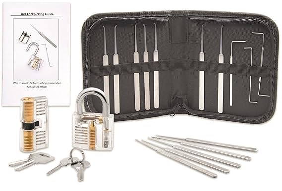 ALLES IN EINEM: 24-Teiliges Dietrich Set + 7 Transparentem Trainingsschlössern, Das modernisierte 31-teilige Lock Pick Set enthält alle Werkzeuge, die Sie benötigen, um einer professioneller Schlosser zu werden TRANSPARENT&BEQUEM: Das Gehäuse des Vorhängeschlosses besitzt eine Acrylqualität, wodurch eine Transparenz auf die Bewegungsinhalte im Schloss ermöglicht werden. Alle Bewegungen und alle Bewegungsauslöser können somit exakt nachvollzogen werden EINFACH&PRAKTISCH: Durch das praktische Lock-Set können Sie mit Leichtigkeit den Mechanismus hinter dem Schlösser knacken erlernen und verstehen. Darüber hinaus ist es ein großartiges Musterstück für den Unterricht, um den Schülern die Funktion eines Schlosses näher zu bringen MEISTER&KÖNNER: Das großartige Lock Pick Set wird Ihnen die Möglichkeit bieten, die Fähigkeit des Schlösser knacken beherrschen zu lernen und dabei viel Spaß und Wissen mitzunehmen. Es sind keine Vorkenntnisse notwendig, sodass es auch für Anfänger und Amateure geeignet ist GARANTIE & Friendly Customer Service --- Wir haben eine Verpflichtung für jeden Käufer 100% Zufriedenheit. Wenn Sie irgendein Problem über unsere Produkte haben, uns einfach Kontakt auf Sie bequem fühlen. › Weitere Produktdetails
