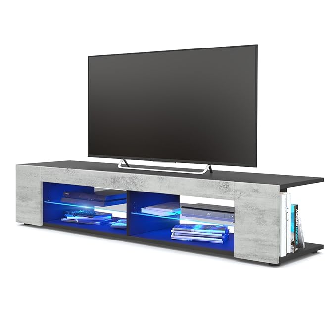 ?TV Board verfügt über 4 offene Fächer mit zwei seitlichen Fächern, in denen Sie CDs, Discs oder Bücher ablegen können. ?Die oberen und unteren Regale, die mittlere Unterseite und die Seitenwände sind mattiert. Die Frontplatte verfügt über ein glänzendes MDF. ?Der Fernsehschrank hat einen farblich einstellbaren LED-Streifen. ?Die Glastrennwand kann die Brillanz des LED-Lichts hervorheben, die sich für Ihr Fernsehgehäuse unterscheidet. ?Maße: 134 x 30 x 39.5 cm (L x B x H)