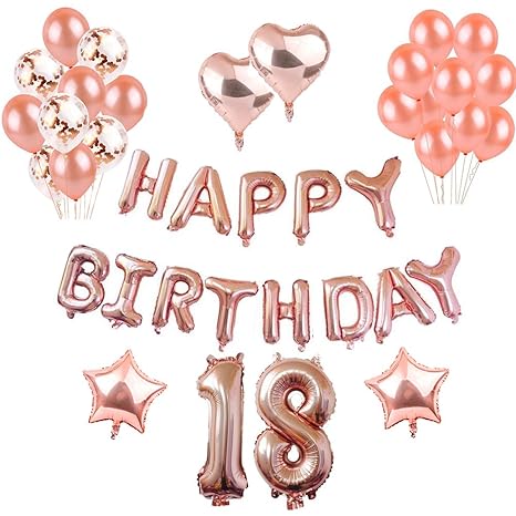 Super Balloons Set Paket beinhaltet: 13 x Rose Gold 'Happy Birthday' Banner, 2 x 18 '' Liebe Herz Folienballons, 2 x 18 '' Star Folienballons, 2 × 40 '' Digital '18' Folienballons, 5 x 12 '' Konfetti Ballons, 20 x 12 '' Rose Gold Latex Ballons, 1 x 2 M Pull Blume, 2 x Band (zufällige Farbe)