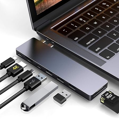 [Designed für MacBook Pro]: GIKERSY Dual-Type-C USB C Hub kompatibel mit MacBook Pro 2018/2017/2016, 13” & 15'; Die Farbe ist FAST Gleich (nicht 100%) wie der Apple MacBook Pro, passt perfekt und hebt das einzigartiges Design hervor. [Große Erweiterung]: Dieser MacBook USB C Hub verfügt über 1*4K HDMI, 2*Type C Anschlüsse (1 Thunderbolt 3 Anschlüss, 1 Datenübertragungsanschluss), 3* USB 3.0 (5 Gbit / s Datenübertragung) und 1 SD und Micro SD Kartensteckplatz. [4K HDMI Adapter]: Der USB C Apdater mit HDMI Port ermöglicht es Ihnen, die Anzeige Ihres Laptops auf Fernseher, Monitor oder Projektor mit der Auflösung bis zu 4K UHD (3840x2160@30Hz) zu spiegeln oder zu erweitern. [Super Speed & Thunderbolt 3]: MBP Hub unterstützt superschnelle Datenübertragungen bis zu 5 Gbit/s, der MacBook Pro Adapter mit Thunderbolt 3 Anschluss ermöglicht Ihnen, Ladung und Datenübertragung für MacBook Pro gleichzeitig zu verwenden. [Plug & Play]: Erfordert keine Software, Treiber. Kann mit Scannern, Druckern, Digitalkameras, Camcords, Lautsprechern, Maus, Tastatur usw zusammenarbeiten. Das Silikon Material an der Unterseite macht USB C Hub stabiler. › Weitere Produktdetails