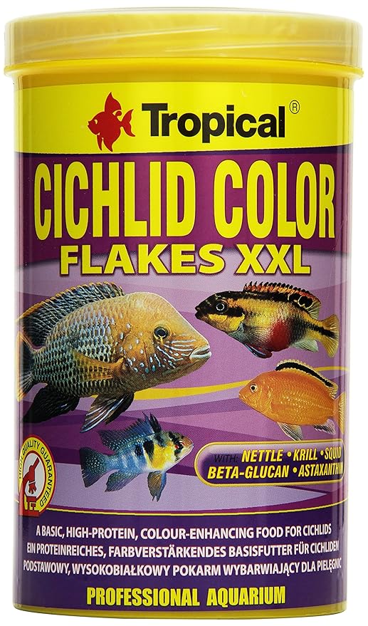 Proteinreiches, Farbverstärkendes Flockenfutter für die tägliche Fütterung alles- und fleischfressender Cichliden enthält Vitamin C und Beta Glucan -> stärken das Immunsystem enthält natürliche Carotinoide (Krill, Spirulina,…) Fütterungsempfehlung: mehrmals täglich in kleinen Portionen › Weitere Produktdetails