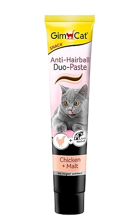Die GimCat Anti-Hairball Duo-Paste mit Hühnchen und einzigartigem Anti-Hairball Complex aus Malz, fördert den Abgang verschluckter Haare und dient als köstliches Katzenleckerli