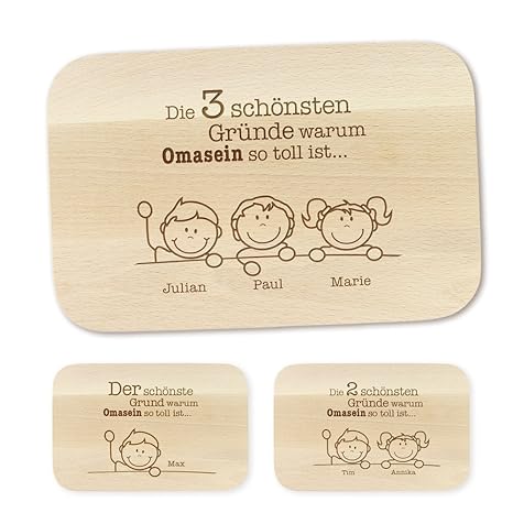 Witziges Frühstücksbrett: Mit diesem Brotbrett beginnt der Tag mit einem Lächeln. Auf das Holzbrettchen werden die Namen der Kinder (maximal 6) der Beschenkten und niedliche Comic-Figuren graviert.
