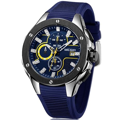 MEGIR Herren Markenuhren - Qualitäts Quarzwerk mit Schwarz Silikonarmband - Angenehm zu tragen. Robustes Design und Groß XL Gehäuse: ca. 52 mm, Passt perfekt herren handgelenk, wirklich ein Hingucker. Männer Uhr Chronograph: Alle kleinen Zifferblätter arbeiten / Kalender / Kratzfestes Mineral Crystal. Diese Stilvolle und sportliche Uhr sieht elegant und schön aus,sehr geeignet für Herren, ein super Geschenk für Ehemann, Geliebten, Bruder, Freunde und so. Wasserdicht bis 3 ATM (30M), die herrenuhr hält Wasserspritzer aus, nicht zum Schwimmen und Duschen geeignet.