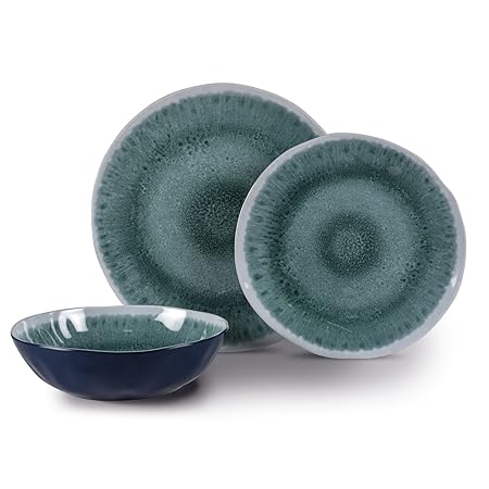 4x Essteller Ø ca. 27,6 cm • 4x Frühstücksteller Ø ca. 23 cm • 4x Schüsseln Ø ca. 19 x 5,2 cm • Farbe: blau-grün • Nahezu unzerbrechlich und kratzfest • Dauerhaft formstabil • Spülmaschinengeeignet • Lebensmittelecht • Geruchs- und geschmacksneutral • Hitzebeständig bis 70°C • Elegantes farbenfrohes Design • Material: 100% Melamin • Gesamtgewicht inkl. Verpackung: ca. 2,3 kg • * Herstellungsbedingte leichte Farbabweichungen können vorkommen.