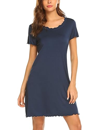 Unibelle Damen Nachthemd Kurzarm Mit Lace Trim V-Ausschnitt Nachtwäsche Baumwolle Lounge Nachtkleid