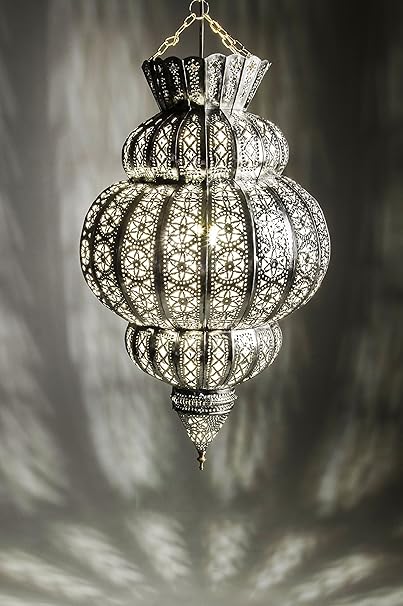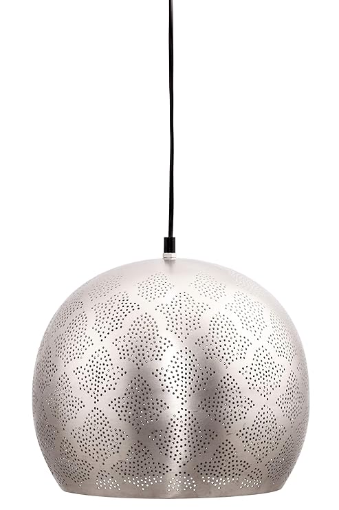 Moderne Deckenlampe, Handarbeit aus Indien, Lampenschirm ist silberfarben von außen und von innen in Orient-form, Schillerndes Design fängt das Licht auf und reflektiert es für einen wunderschönen Effekt, Die Perforationen zaubern orientalische Schattenspiele in ihren Raum | Schillerndes, warmes, beruhigendes, sanftes und romantisches Licht für eine entspannte und romantische Atmosphäre. Die Form dieser Arabische Deckenleuchte ist orientalisch arabisch, die Perforation ist marokkanisch indisch, diese Orientlampe passt hervorragend als Dekoration für kreative Deko Ideen, für eine romantische Beleuchtung im Schlafzimmer, Esstischlampe im Esszimmer, als Pendellampe in der Küche, Hängelampe im Büro, Nachtlicht im Flur, oder als Geschenk. Größe: 33cm breit und 51cm Hoch, Ohne Aufhängung | Farbe: Silberfarben | Material: Metall silberfarbig | Diese Handgemachte Wohnzimmerlampe hat eine Leuchtquelle, Die Elektrik ist inklusive mit einer E27 Fassung bis max. 40 Watt, Kabel und Kette 120cm lang, und eine Deckenbaldachine, Die Höhe ist verstellbar | Passend für die E27 Leuchtmittel (LED, Glühlampe, Energiesparlampe) | Leuchtmittel ist nicht im Lieferumfang enthalten. Bei uns finden Sie eine große Auswahl an moderne oder rustikale Leuchten | Der Leuchtenschirm bunt oder schlicht, in Weiß, Schwarz, Silber, Gold oder Kupferfarben. Aus Messing, Leder, Stoff, Aluminium, Glas oder Eisen, mit Verzierung oder ohne, klein, Mittel oder groß | zum Hinstellen als Stehleuchte, für die Wand als Wandleuchte oder für die Decke zum Hängen als Pendelleuchte | in allen Design Richtungen wie Industrial, Vintage, Retro, Landhaus, Kolonialstil, shabby oder Modern. Bei den von uns angebotenen Artikeln, handelt es sich um echtes, orientalisches Kunsthandwerk. Echte Handarbeit und keine Massenproduktion, Marke: Marrakesch Orient & Mediterran Interior › Weitere Produktdetails