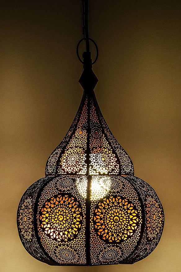 Die Form dieser Deckenleuchte ist orientalisch arabisch, die Perforation ist marokkanisch indisch, diese Orientlampe passt hervorragend als Dekoration für kreative Deko Ideen, für eine romantische Beleuchtung im Schlafzimmer, Esstischlampe im Esszimmer, als Pendellampe in der Küche, Hängelampe im Büro, Nachtlicht im Flur, Gartenbeleuchtung im Garten, Terrasse oder Balkon oder als Geschenk.