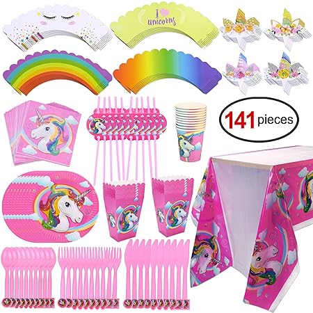 Howaf 100-teilig Einhorn Party Set, Einhorn Partygeschirr Pappteller Pappbecher Tischdecke Cupcake Toppers Wrapper Einladungs