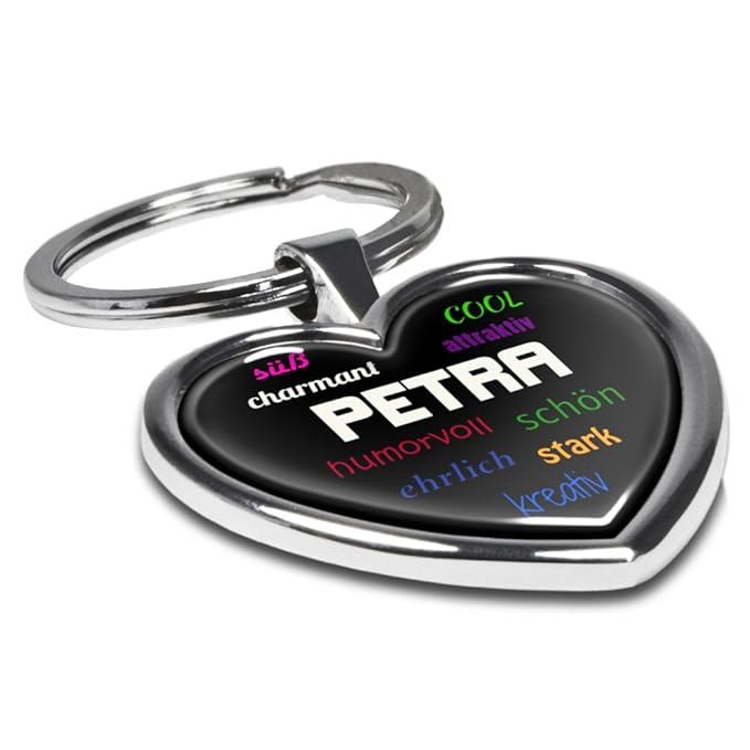 Verchromter Herz-Schlüsselanhänger aus Metall Personalisierter Schlüsselanhänger mit dem Namen 'Petra' Robuste Ausführung in Premiumqualität Namensschlüsselanhänger einseitig mit „3D“-Effekt Besonders stabile Oberfläche durch die glasklare, gewölbte (Doming-) Oberfläche › Weitere Produktdetails