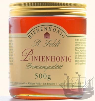 Pinienhonig (Kiefernhonig), flüssig, Herkunft: Türkei / Laborgeprüft, Geschmack: süßlich aromatisch, caramellig, würzig Verwendungsmöglichkeiten: als Aufstrich, zum Süßen von Tee Dieser Pinienhonig wurde im Labor geprüft, u.a. auf Sorte und Qualität Schonende Aufbereitung und Abfüllung in unserem eigenen Betrieb in Deutschland unter hygienisch einwandfreien Bedingungen Es werden keine Geschmacksverstärker, Aromastoffe oder ähnliches verwendet. › Weitere Produktdetails