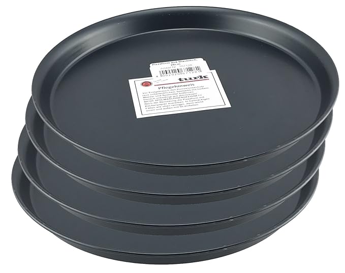 Für den puren Genuss: Backbleche für die Zubereitung und das Backen von Pizza oder originalem Flammkuchen - Die Bleche sorgen für schön geformte Backwaren 4er Set: 4 Pizzableche im Set - Dank des Backsets können Sie Pizzen für die ganze Familie zubereiten und in den Ofen schieben - Auch für die gastronomische Nutzung Gut zu händeln: Die runden Pizzabackbleche passen in jeden Ofen und jedes Waschbecken - Die Pizzateller lassen sich bis zu einer Temperatur von 250 °C erhitzen Pflegeleicht: Die Flammkuchenbleche haben eine Antihaftbeschichtung - Die leicht zu reinigende Oberfläche lässt geschmolzenen Belägen und Krümeln keine Chance Starke Basics: Pizzableche mit jeweils ca. 33 cm Durchmesser an der Oberkante und 29,5 cm am Boden - Die Pizzaformen aus Carbonstahl wiegen einzeln nur ca. 0,3 kg