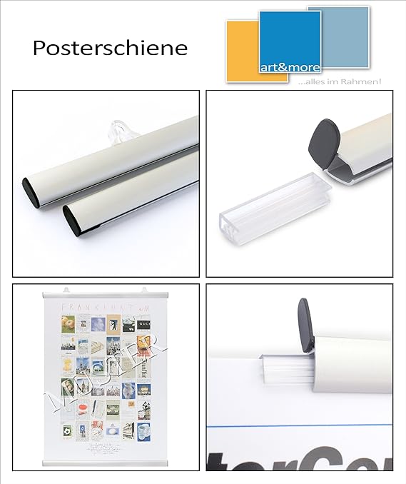 60cm Posterschienen Set aus hochwertigem silber eloxierten Aluminium Die obere Plakatschiene wird mit einem zentrierten Loch ausgeliefert Einfache Handhabung durch mitgelieferte Klemmstücke; Anzahl variiert je Länge Aufhänge Stahlnagel im Lieferumfang enthalten. Länge = Nutzmaß Beste Qualität direkt vom Hersteller