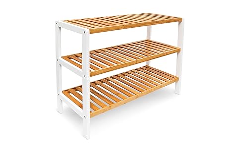 Vielseitig einsetzbar - Der Schuhschrank bietet auf 3 Ebenen ausreichend Platz für 9 Paar Schuhe - Stauraum für alle Schuharten aber auch zum Aufbewahren von Taschen, Decken uvm. geeignet Stilvoll und robust - Das Regal besteht aus hochwertigem Bambus - Das Holz verfügt über eine edle Optik und ist zudem feuchtigkeitsbeständig - Nasse Schuhe können einfach reingestellt werden. Platzsparend - Insgesamt misst die Schuhablage 54,5 x 70 x 24,5 cm (HBT) - Passt auch in kleine Ecken oder enge Flure und Treppenhäuser - Die weiß lackierten Seitenteile setzen einen besonderen Akzent. Einfache und schnelle Montage - Dank der beiliegenden Aufbauanleitung und des enthaltenen Montagematerials kann der Schuhschrank problemlos auch allein zusammengebaut werden. Das Schuhregal aus Bambus kann dank der offenen Seiten bequem transportiert werden - Erweist sich als natürlicher Blickfang in Flur, Treppenhaus, Keller, Schlaf- und Kinderzimmer