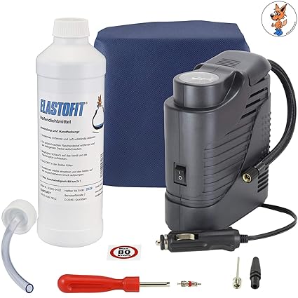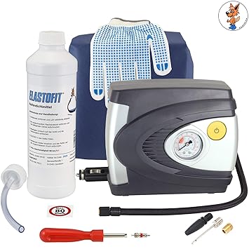 500 ml Flasche Elastofit Reifendichtmittel für alle PKW, mind. 10 Jahre haltbar Bleibt im Reifen flüssig, kein verkleben an Reifen, Felgen oder Reifendrucksensoren Dichtet Verletzungen bis 8 mm sicher ab Ohne Lösungsmittel und leicht brennbare oder explosive Stoffe Metall-Ventilkappe mit integriertem Ausdreher, Handschuhe, Füllschlauch, Ersatzventileinsatz, Aufkleber max. 80 km/h, Bedienungsanleitung