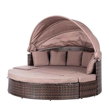 ? Hochwertige Gartenmöbel ?Exklusive XXL Poly Rattan Sonneninsel Ø 230cm in Braun der Marke DEUBA - Luxus für Ihren Garten! ? Hoher Sitz- & Liegekomfort ?7cm dicke Sitzauflagen und 4 bequeme Kissen sorgen für einen hohen Sitz- und Liegekomfort. Die Auflagen sind verbunden, dies hilft gegen Verrutschen! Die Bezüge haben außerdem einen Reißverschluss und können so bei Verschmutzung einfach abgenommen und gewaschen werden. ? Faltbares Sonnenschutzdach ?Das faltbare Sonnenschutzdach mit Gasdruckzylindern spendet bei Sonne angenehmen Schatten und schützt vor Wind. ? 2in1 Sonneninsel - Sitzgruppe ? Die module Bauweise der Sonneninsel lässt sich mit wenigen Handgriffen von einer großen Lounge-Liege in eine Sitzgruppe mit Tisch für mehrere Personen verwandeln. ? Extra hohe Stabilität ?Ein extra verstärktes Metallgestell, plus verstellbare Schraubfüße an der Unterseite der Liege, sorgen auch auf unebenen Untergründen für einen sicheren Stand.