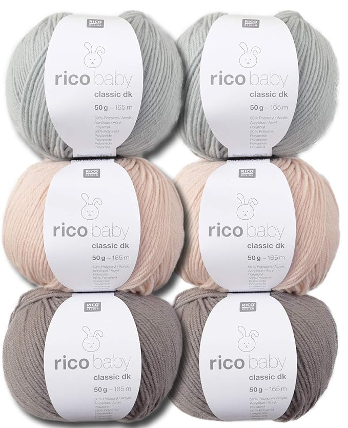 Babywolle Rico Design Set: 6 x 50 g = 300g Babywolle Rico Baby Classic Lauflänge je 50 g = ca. 165 m Materialverbrauch Pullover Größe 74/80 ca. 150g Nadelstärke: 3,5 - 4 mm, pflegeleicht, waschmaschinengeeignet Material: 50% Polyacryl / 50% Polyamid