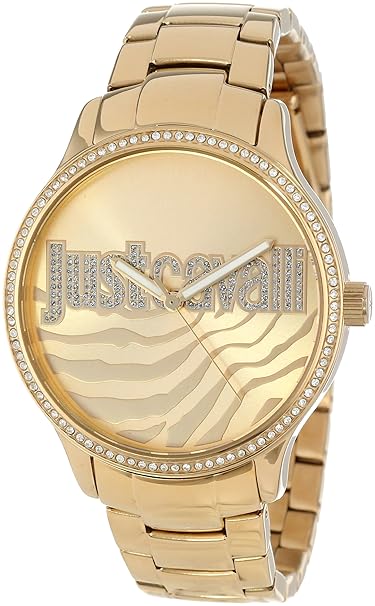 Pink Dial with clear crystals embodied Stainless Steel& Gold Case Gold Stainless Steel Bracelet Just Cavalli logo on the dial&Crystals on strap Water-resistant to 5 bar (50 metres/166 feet): withstands rain and splash of water, but not showering or submersion